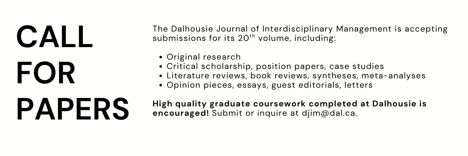 The Dalhousie Journal of Interdisciplinary Management (DJIM) is a diamond open-access and peer-reviewed interdisciplinary journal that publishes works submitted by graduate students at Dalhousie University. The purpose of the journal is to provide an accessible platform for early-career researchers and early-career professionals to share their works with the academic community.